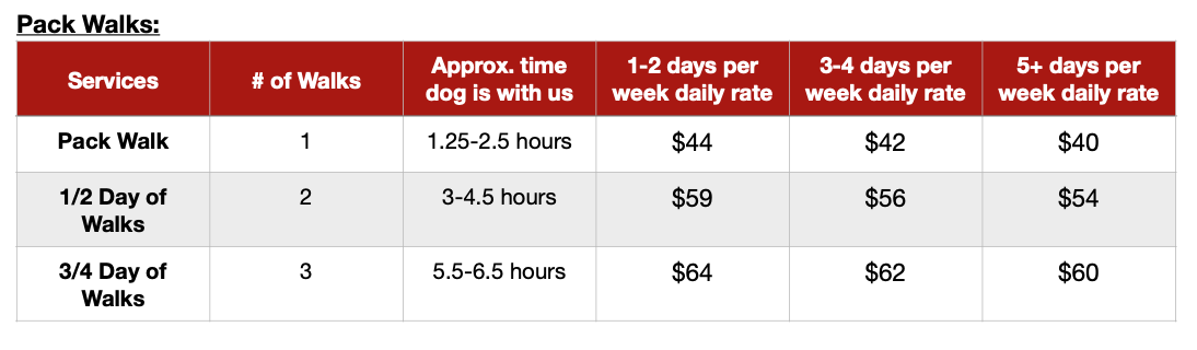 a pack walk, a slow pack walk, 1/2 day of walks, or a 3/4 day of walks