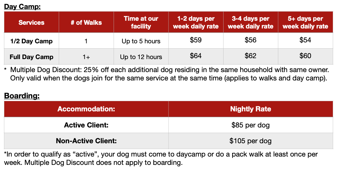 **Multiple Dog Discount: 25% off additional dogs residing in the same household with same owner. Only valid when the dogs join for the same service at the same time (applies to walks and day camp)